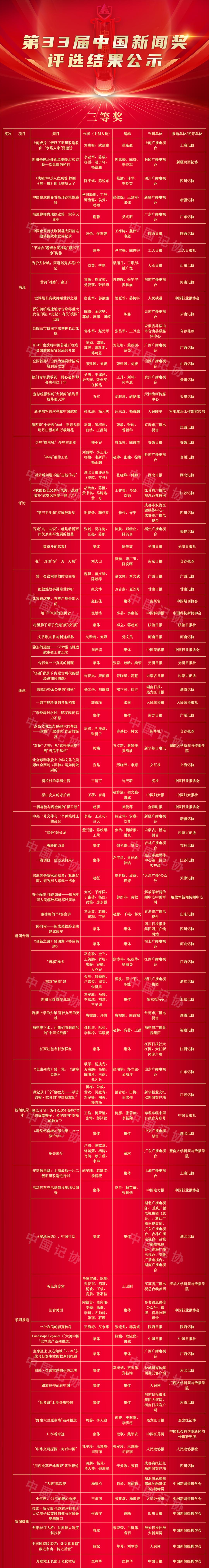由中华全国新闻工作者协会(简称“中国记协”)主办的第33届中国新闻奖评选结果自今日起在中国记协微信公众号、中国记协网公示。本届拟获奖作品378件,其中特别奖3件、一等奖74件、二等奖114件、三等奖187件。