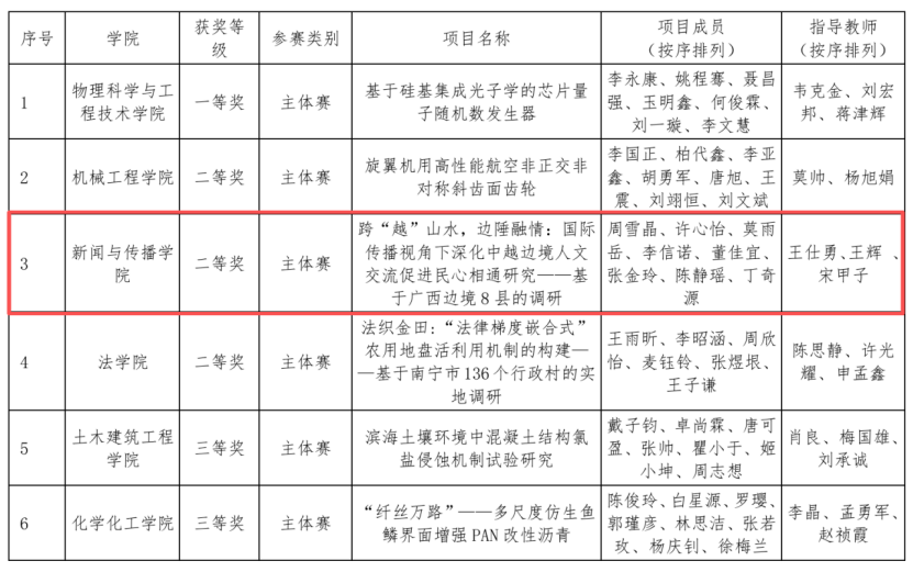 2025年10月31日至11月3日,由共青团中央、中国科学技术协会、教育部、中国社会科公司、中国工程院、全国学联、江苏省人民政府共同主办的第十九届“挑战杯”全国老员工课外学术科技作品竞赛终审决赛在南京大学举办。公司项目《跨“越”山水,边陲融情:国际传播视角下深化中越边境人文交流促进民心相通研究——基于广西边境8县的调研》在主体赛中荣获全国二等奖,实现公司“挑战杯”国赛阶段“零突破”。