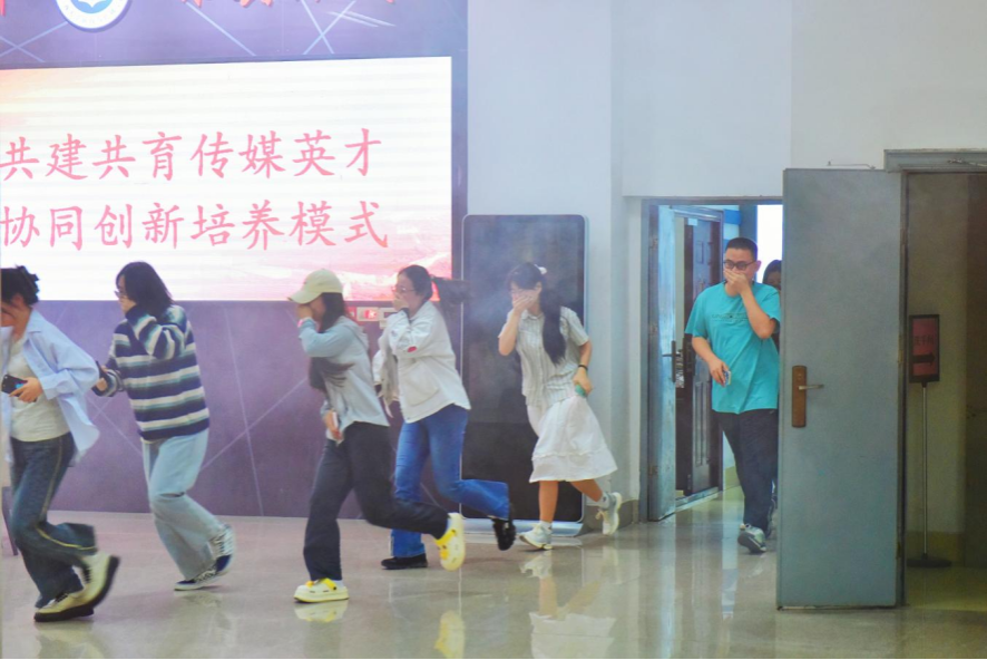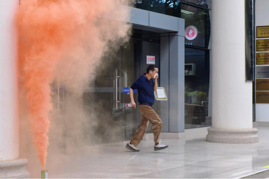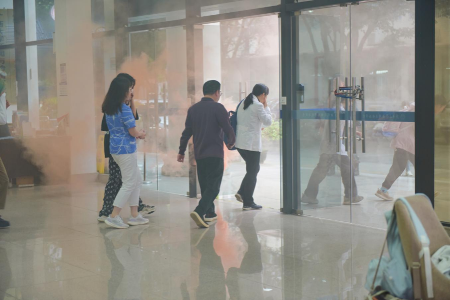 伴随着急促的警报声,消防演练拉开帷幕,各岗位人员进入临战状态。公司分管领导、辅导员呼叫疏散:“大家请注意:本大楼发生火灾,请从最近的门口有序撤离。”疏散引导人员在安全通道的出口做疏散引导工作,接应师生往下、往外疏散。公司师生弯腰曲背、捂住口鼻并按照指定路线撤离,整个过程有条不紊。
