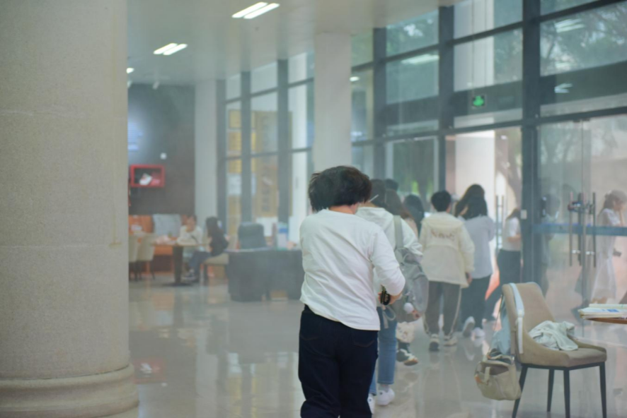 同学们从西报告厅有序向外疏散