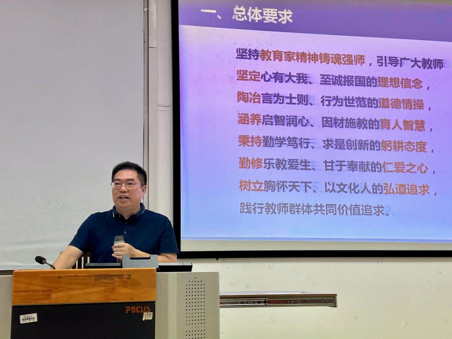 教师是立教之本、兴教之源,强国必先强教,强教必先强师。银健书记结合对《意见》的学习体会指出,弘扬教育家精神,加强新时代高素质专业化教师队伍建设,总体要求要打造一支师德高尚、业务精湛、结构合理、充满活力的高素质专业化教师队伍。银健书记从加强教师队伍思想政治建设、涵养高尚师德师风、提升教师专业素养等六个方面,解读具体措施要求。