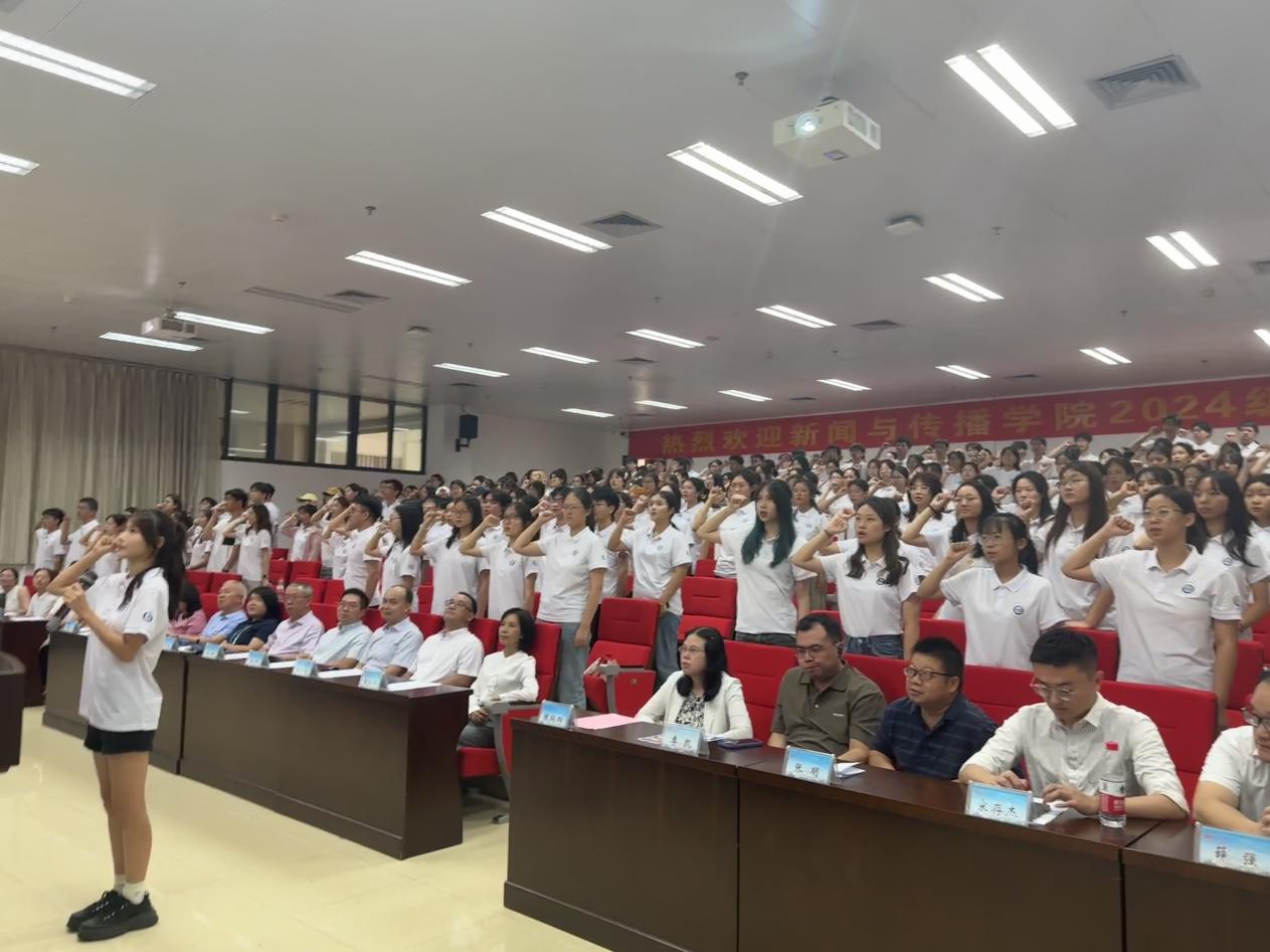 24级新生陈思元代表全体新生发言。她表示,“我们要以饱满的热情不懈努力,去追求新闻的真谛,去锤炼自己的专业技能。”陈思元建议同学们注重培养创新意识和跨界融合能力,不断拓宽视野和思路,为学习注入更多活力和创意。