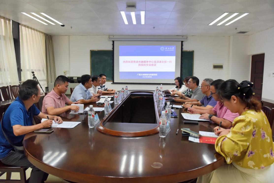 2024年9月5日,贵港市融媒体中心主任、总编辑庞泽涛等一行六人到公司参访交流,公司党委书记银健,经理王仕勇,公司党委副书记邓惠英,副经理胡昌文、广告与传媒经济系主任陈瑞群,院团委书记刘梦娟出席交流活动。