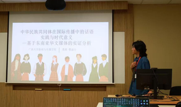 在助理教授莫莉指导下,硕士研究生曹涵兮在“华文媒体与区域发展”分论坛上(专题为“东南亚华文传媒”),以《中华民族共同体在国际传播中的话语实践与时代意义—基于东南亚华文媒体的实证分析》为题作报告。他在报告中指出,东南亚国家是中华文明辐射圈层中的重要组成部分,在民族治理和区域合作中有着强烈的共同体构建诉求,是“中华民族共同体”对外传播的天然土壤。研究系统爬梳东南亚主流华文媒体中“中华民族共同体”相关报道,使用费尔克拉夫三维框架展开话语分析。研究发现,东南亚华文媒体围绕民族发展、文化、关系与治理等核心主题,以中国大陆媒体为主要信源,融合政治、学术、文化等多元话语,形成了三种特色报道模式;“中华民族共同体”理念内在契合东南亚“多元一体”发展趋势,为多民族国家治理提供中国智慧,以“和合”思想赋予海外华人推动构建人类命运共同体的重大使命。