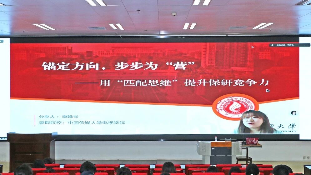 新闻222班李姝岑通过线上连线进行分享,她已保送至中国传媒大学,并着重分析了外校考核体系,指出绩点排名、英语成绩与科研成果尤为重要。她建议同学们借助大创项目构建与目标院校匹配的研究体系,并分享了时间管理等方面的实用经验。