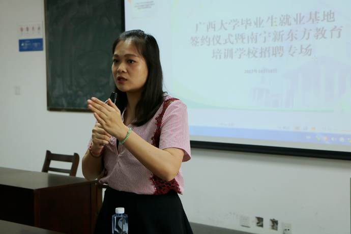 最后,同样是西大员工的梁丽丽经理对新东方招聘的部门分类、工作内容、招聘需求以及工资待遇等做了简单介绍。在新东方工作长达七年的她表示,十分开心能看到在座的年轻、新鲜的血液,也希望能有更多的西大学子加入新东方。