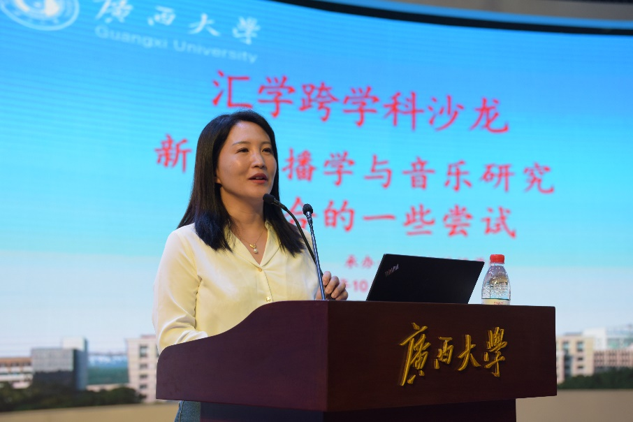 活动现场,不同学科领域的老师进行学术交流。艺术公司副经理欧阳宜文就国际音乐交流在我国面向东盟国家话语中的功能研究和定性比较分析(QCA)视角下的广西壮族音乐传播研究两个案例向大家分享了她对新闻传播学与音乐研究相结合的一些尝试。