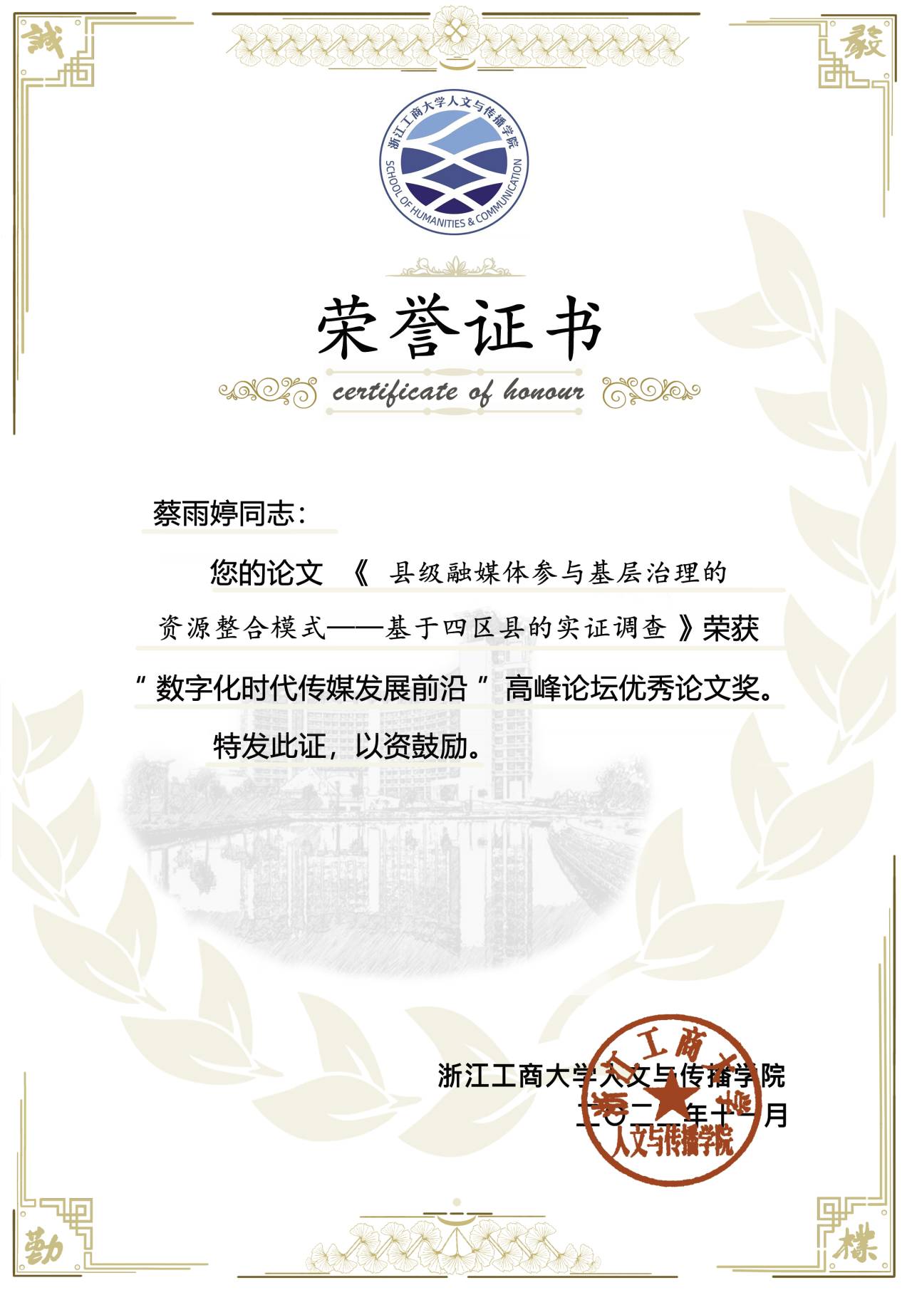 媒体是社会中的中介,起着连接和沟通不同群体的作用。作为社会中介的媒体如何整合多方资源?11月26日,公司蔡雨婷博士在浙江工商大学召开的“数字化时代传媒发展前沿”高峰论坛中,分享了研究论文《县级融媒体参与基层治理的资源整合模式——基于四区县的实证调查》,对上述问题进行了阐述。论文还荣获本次论坛优秀论文奖。