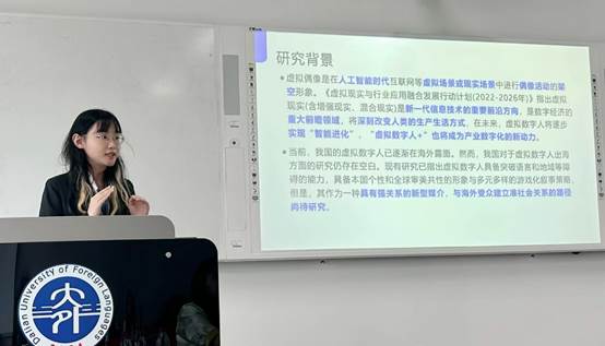 杨名宜和董佳宜在“人工智能与国际传播效能提升”的分论坛中以《技术赋能的出海之路:虚拟偶像的准社会交往研究》为题进行了学术报告。论文从虚拟偶像对外传播的研究意义、虚拟偶像呈现的审美共性和虚拟偶像与海外受众的情感递进等部分展开,研究指出技术以媒介形式为虚拟偶像与海外受众建立准社会关系提供重要支撑,技术主导下的作品叙事逻辑及其效果性能使虚拟偶像更具审美价值,传受双方有关技术改进的良性互动提供实现文化互通的可能。