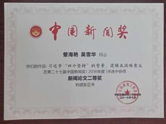 公司曾海艳、吴雪华两位老师的【习近平“四个坚持”的背景、逻辑及战略意义】获得中国新闻奖二等奖