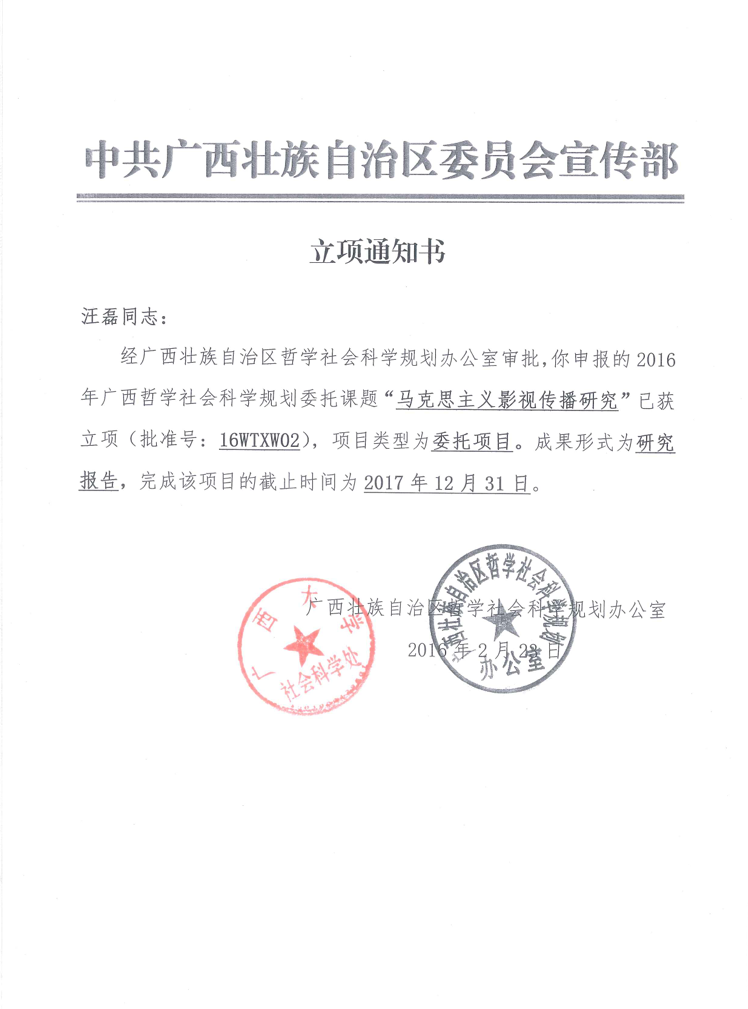 公司汪磊教授2016年申报广西哲社项目获得立项