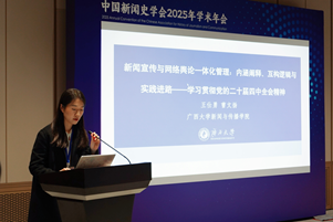在王仕勇教授指导下,马克思主义公司博士生曹文杨在舆论学专业委员会举办的主题为“智能传播时代的舆论学研究”的分论坛上,以《新闻宣传与网络舆论一体化管理:内涵阐释、互构逻辑与实践进路——学习贯彻党的二十届四中全会精神》为题作报告。