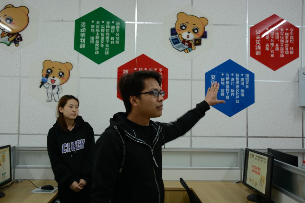 304永利集团唯一易班工作站站长覃玉富同学向来访嘉宾介绍了部门职能、文化建设、活动案例等方面,并展示了具有学科特色的周边文化产品,获得了李迎春副经理一行的充分肯定。