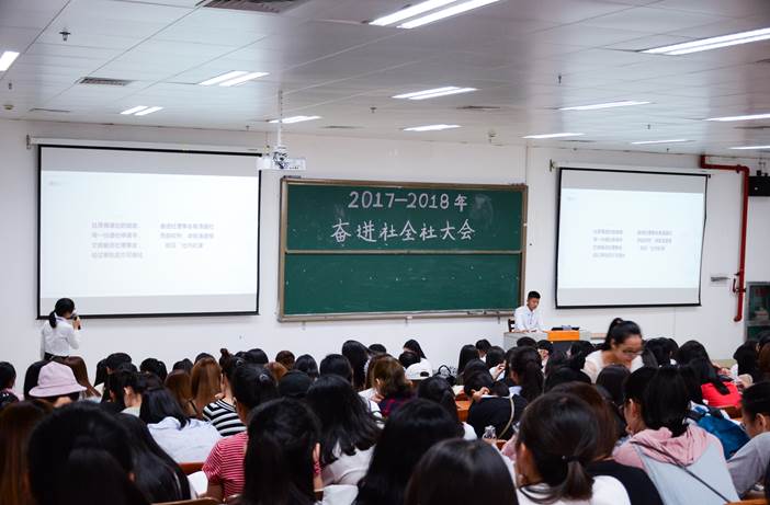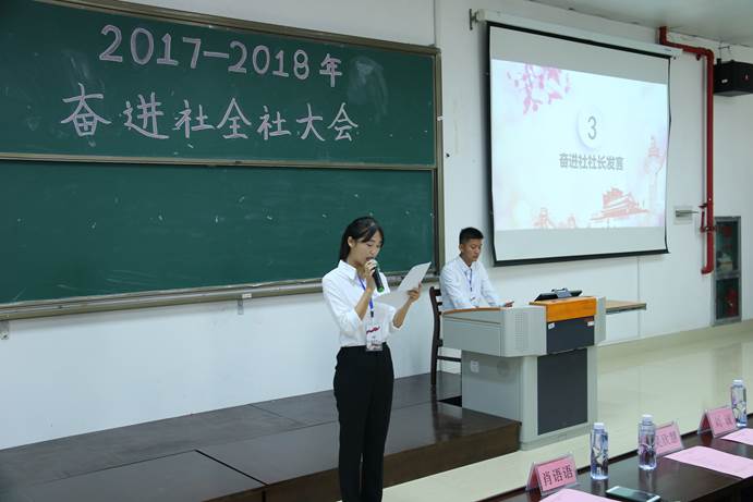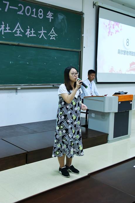 在吴欣慧老师的致辞中,充分肯定了奋进社这一年来的工作成绩,并指出“作为一名入党积极分子,要自觉学习党的政策知识,用科学的理论武装自己。”