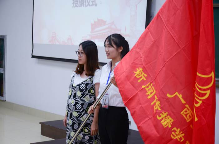 在一片掌声中,吴欣慧老师向新一届社长肖语语同学授予了社旗。