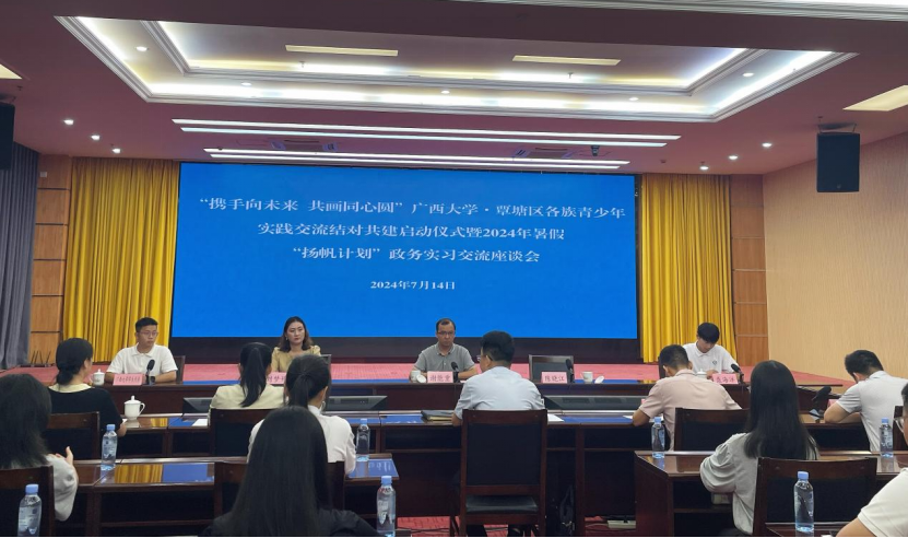 7月14日上午,解说团一行抵达覃塘区,首先参加了“携手向未来 共画同心圆”304永利集团·覃塘区各族青少年实践交流结对共建启动仪式暨2024年暑假“扬帆计划”政务实习交流应谈会。“扬帆计划”政务实习交流应谈会的举行,也为即将参与政务实习的同学们提供了宝贵的指导和建议,帮助他们更好地了解政务工作,为未来的职业选择奠定基础。