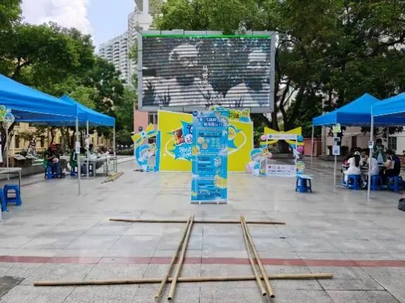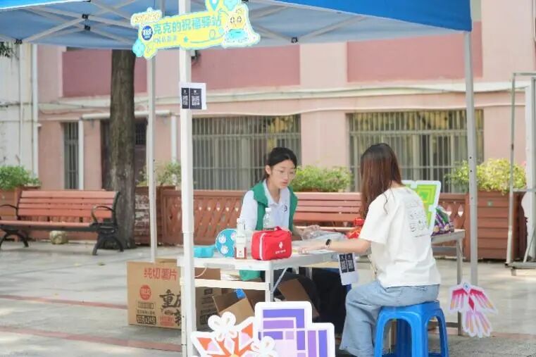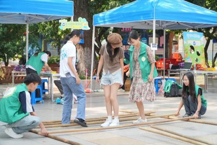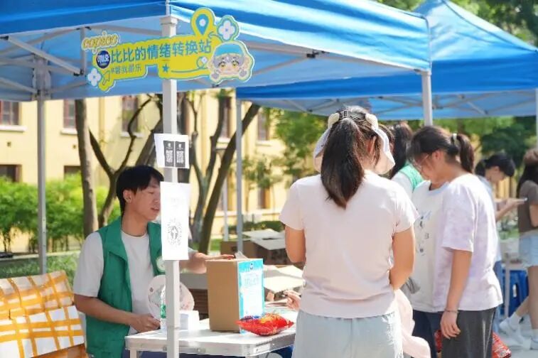 在现场互动环节,团队策划了四个活动板块,分别是“可可的土豆乐园”、“比比的情绪转换站”、“克克的祝福驿站”、非遗竹竿舞挑战,并成功与公司“心理健康成长团”达成合作。现场同学们踊跃参与,在“可可的土豆乐园”畅玩沙包游戏,在“情绪交换箱”用明信片记录此刻的感受,在“祝福驿站”静下心来用“拼豆豆”一点一点勾勒出自己喜爱的角色,在富有节奏的竹竿开合间,同学们不仅体验了广西本土文化的魅力,更在协作与欢笑中增强了连接感,将现场快乐氛围推向高潮。