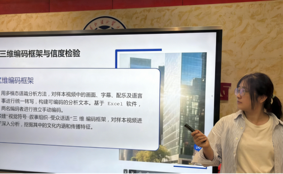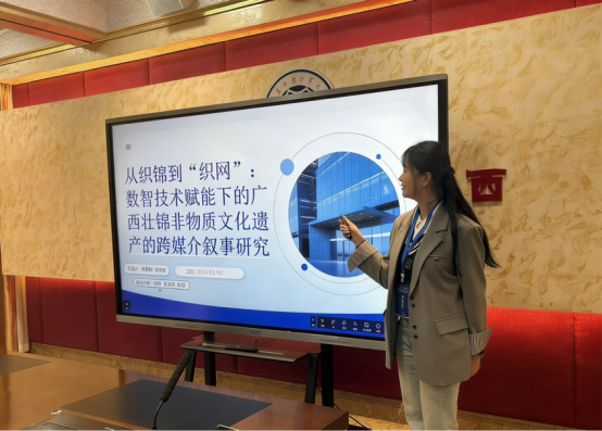 在党琼副教授指导下,硕士研究生陈鑫雨、杨天琦在平行论坛三中,以《从织锦到“织网”:数智技术赋能下的广西壮锦非物质文化遗产的跨媒介叙事研究》为题作报告。研究聚焦广西壮锦在国际短视频平台的跨媒介叙事实践,采用多模态语篇分析法,对核心视频样本及评论进行系统编码与统计。研究揭示,壮锦在数智赋能下实现三重传播路径演进:视觉层面完成从手工织造到屏幕呈现的再现转化;叙事层面实现从静态织物到多模态故事的情感重构;文化层面推动从地方技艺到全球符号的身份拓展。针对当前传播中文化识别度低、情感共鸣浅层化等挑战,报告提出中国非遗面向东盟的跨文化传播的符号解码、跨平台叙事互补等核心优化路径。