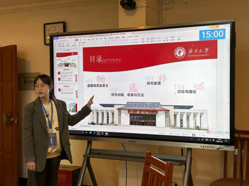 在刘晓慧副教授指导下,硕士研究生李淼在平行论坛一中以《东盟媒体视域下的中国共产党国际形象研究—以马来西亚<新海峡时报>为例》为题作报告。该研究采用批评话语分析与语料库相结合的方法,聚焦马来西亚《新海峡时报》2020年至2024年期间刊发的中国共产党的相关报道,系统解析中国共产党形象建构。研究发现,该报在文本层面塑造了中共“国内发展引领者”与“全球合作推动者”的双重形象;话语实践层面采用“内外信源互补、权威与认可并重”的叙事逻辑,强化其国内外影响力;在社会实践层面,该报的中共形象建构实践是马来西亚在复杂的场域互动、符号权力运作和记者惯习内化等多重机制作用下形成的策略性选择。
