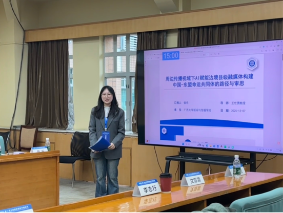 在王仕勇教授的指导下,硕士研究生曾乐在平行论坛二上作题为《周边传播视域下AI赋能边境县级融媒体构建中国-东盟命运共同体的路径与审思》的报告。研究聚焦中国-东盟边境地区,针对县级融媒体中心面临的资源匮乏与传播困境,引入“周边传播”理论和“晕染传播”核心范式。研究系统阐释了人工智能技术如何从信息软联通、文化情感共鸣、区域治理服务三个维度,赋能边境融媒体实现从“传播末梢”向“战略区域节点”的功能跃升。研究同时审慎指出了“技术伪赋能”、数据主权与算法偏见等潜在风险。报告强调,未来的智能化转型必须坚持技术赋能与人文校准相结合,使边境融媒体真正成为夯实中国-东盟命运共同体民意基础的坚实桥梁。