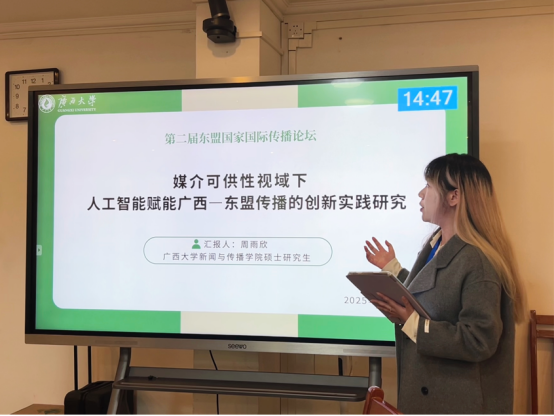 在张剑副教授指导下,2024级硕士研究生周雨欣在平行论坛一中以《媒介可供性视域下人工智能赋能广西—东盟传播的创新实践研究》为题作分享报告。在人工智能技术深刻影响国际传播的背景下,她聚焦广西面向东盟的相关传播实践,探讨如何以人工智能积极应对跨境传播中的文化折扣、单向输出与技术不平等困境。研究以媒介可供性理论作为核心分析框架,探索人工智能如何为内容生产、跨文化互动、跨境场景传播与跨国协同合作提供新型行动路径,最终为构建具有韧性、包容性与创新性的中国—东盟智能传播共同体贡献效能。