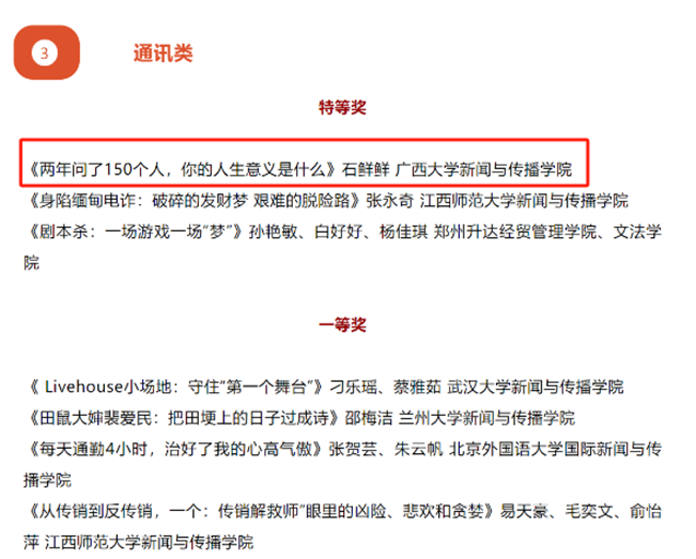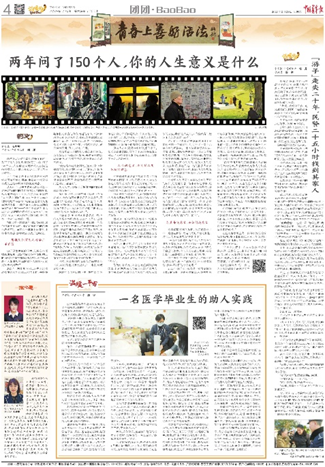 通讯类特等奖作品《两年问了150个人,你的人生意义是什么》原载于《中国青年报》2023年2月28日04 版,以深度报道的形式记录了某B站博主在骑行旅途中追问人生意义的故事,丰富了读者对于生命的理解,探寻每一代青年在成长过程中都面临的现实困惑。