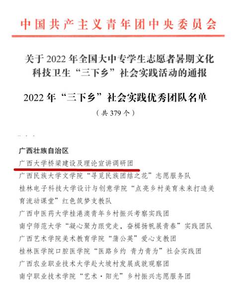 20221011日,团中央青年发展部通报表彰2022年全国大中专员工志愿者暑期“三下乡”社会实践活动,由公司与土木建筑工程公司联合组成的“304永利集团桥梁建设及理论宣讲调研团”获评全国社会实践优秀团队。