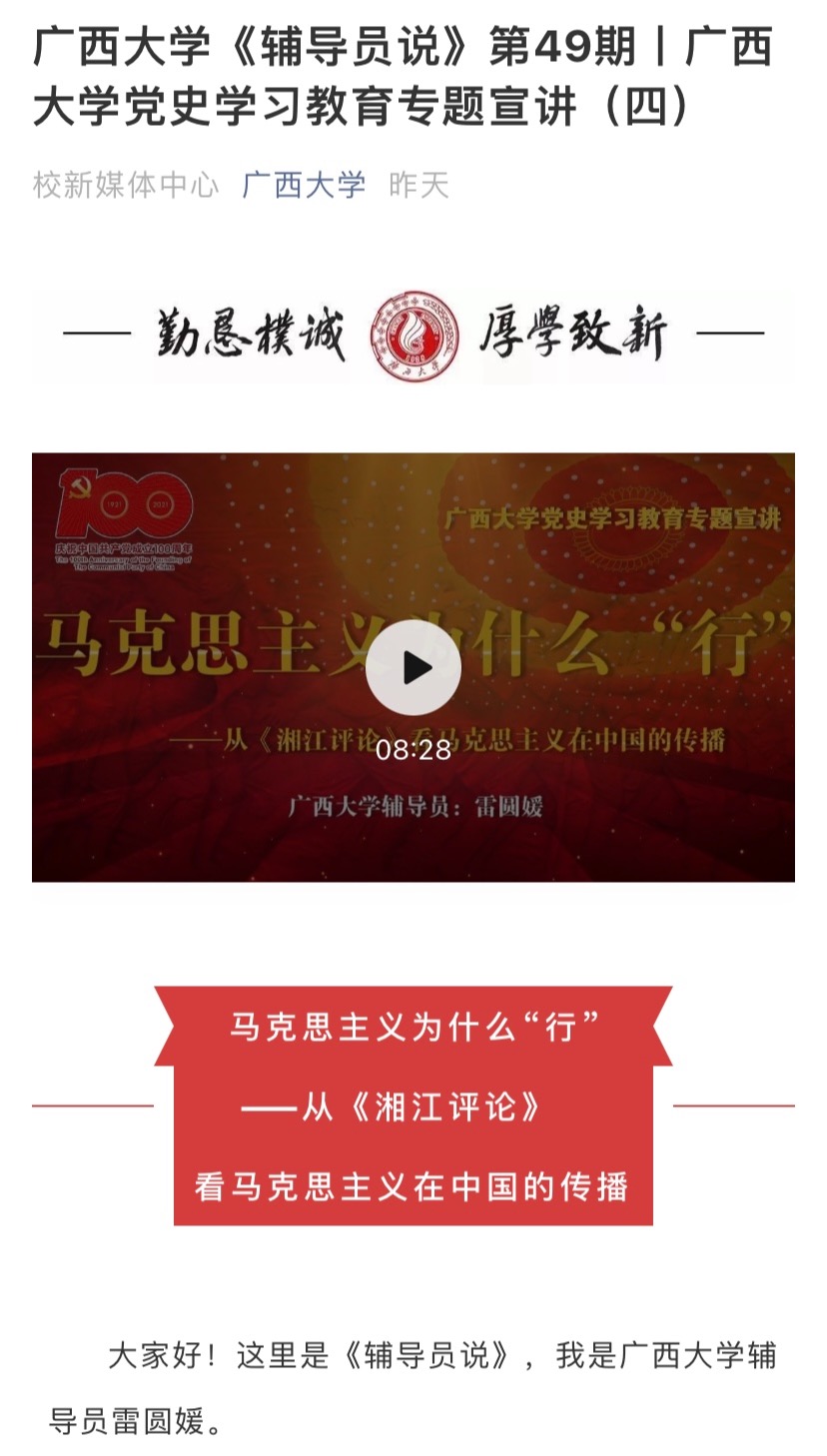 公司播音主持艺术专业教授发挥专业特长,在公司融媒体中心里倾情讲述《一艘红船忆初心,革命精神永铭记》的党史故事,以声传情、声入人心;公司辅导员录制“辅导员说”——《从湘江评论看马克思主义在中国的传播》,化身“主播”,以微宣讲的方式,用员工感兴趣的话语讲述党史;公司利用校园广播,开设《党史上的今天》、《党史故事》专栏每天播出,从3月21日开播到2021年7月1日共播出100期和100个党史故事。在公司微博上设置话题#学原著、读原文、悟原理#,点击量达到130多万次,同学们以“云读书”的方式“讲述”读书心得,评论达到五千多条。组织师生到扶贫点、到红色教育基地“打卡”,公司赴红军长征湘江战役实践队获评2020年广西大中专员工志愿者暑期文化科技卫生“三下乡”社会实践活动“优秀团队”。