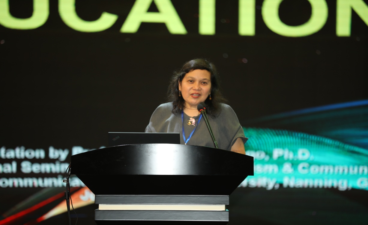 菲律宾大学大众传播公司经理 Arminda Vallejo Santiago(阿曼达·瓦莱乔·圣地亚哥)在简要介绍了菲律宾媒体发展的历史后,着重探讨了第四次工业革命和数字时代下技术的快速发展,如何给菲律宾新闻教育带来挑战。